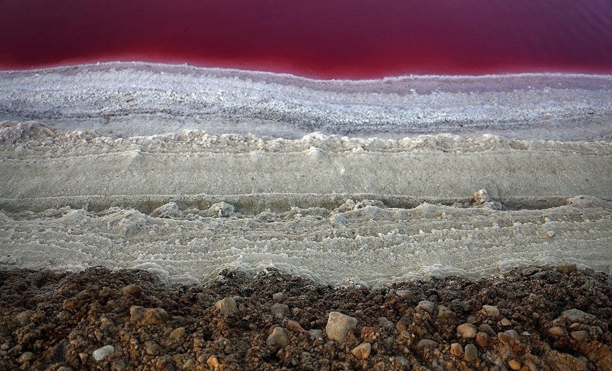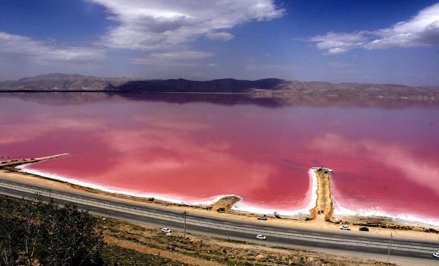 By mid-summer and due to high evaporation rates and salt concentrations, the lake water turns pinkish red as a result of the red tide within the lake.The pink color is due to the presence of algae that produces carotenoids (organic pigments), such as Dunaliella salina - a type of halophile green micro-algae especially found in sea salt fields.